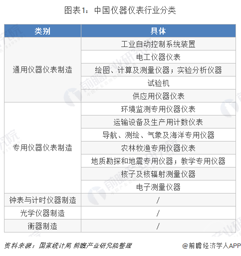 儀器儀表應用領(lǐng)域廣泛,覆蓋了工業(yè)、農(nóng)業(yè)、交通、科技、環(huán)保、國防、文教衛(wèi)生、人民生活等各方面,在國民經(jīng)濟建設各行各業(yè)的運行過程中承擔著把關(guān)者和指導者的任務。根據(jù)《國民經(jīng)濟行業(yè)分類》(GB/T4754-2017),儀器儀表制造行業(yè)可以分為通用儀表儀器制造、專用儀器儀表制造、鐘表與計時儀器制造、光學儀器制造和衡器制造。