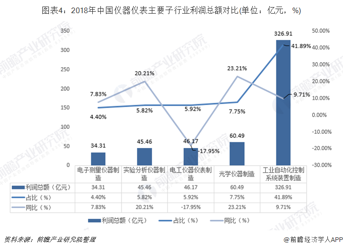 2018年儀器儀表子行業(yè)中主營收入排名第一的子行業(yè)是工業(yè)自動化控制系統(tǒng)裝置制造,實現(xiàn)利潤總額326.91億元,同比增長9.71%。光學儀器制造、電工儀器儀表制造、實驗分析儀器制造和電子測量儀器制造分別排名二至五位,利潤總額分別為60.49億元、46.17億元、45.46億元和34.31億元。