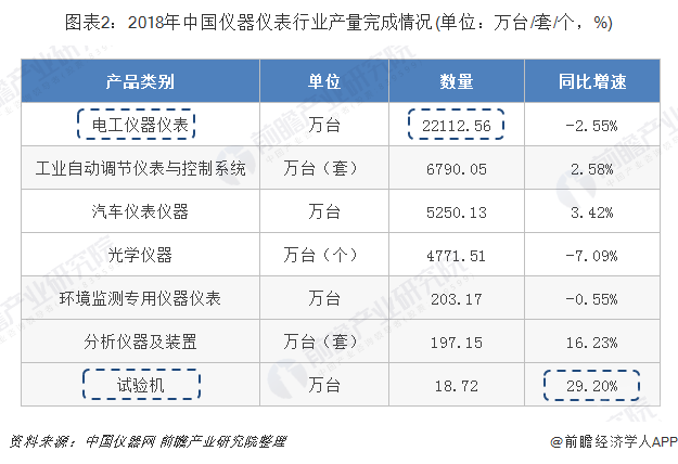 2018年電工儀器儀表、光學儀器、環(huán)境監(jiān)測專用儀器儀表產(chǎn)量下降,其余儀器儀表產(chǎn)量提高,其中試驗機的產(chǎn)量提高幅度最大,同比增速29.2%。電工儀器儀表產(chǎn)量最高,2018年為22112.56萬臺,同比下降2.55%。
