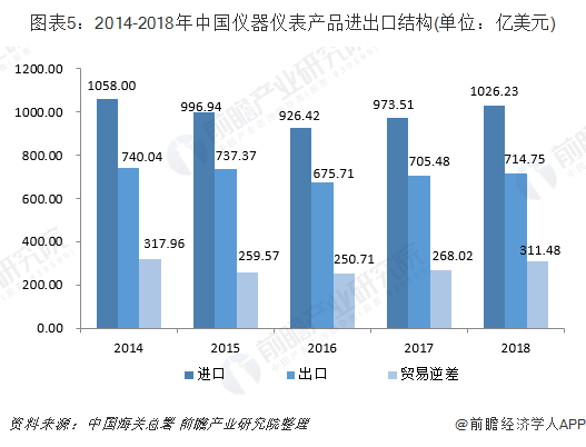 從下圖可以看出,我國儀器儀表產(chǎn)品長期處于進出口貿(mào)易逆差的狀態(tài),2018年我國進口儀器儀表產(chǎn)品金額達到1026.23億美元,出口金額714.75億美元,貿(mào)易逆差繼續(xù)擴大至311.48億美元。