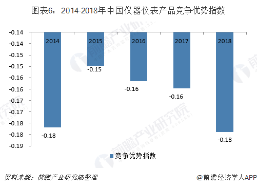 2014-2018年儀器儀表競爭優(yōu)勢指數(shù)維持在(-0.3,0)區(qū)間,2018年為-0.18,說明儀器儀表產(chǎn)品在全球具有微弱的競爭劣勢。